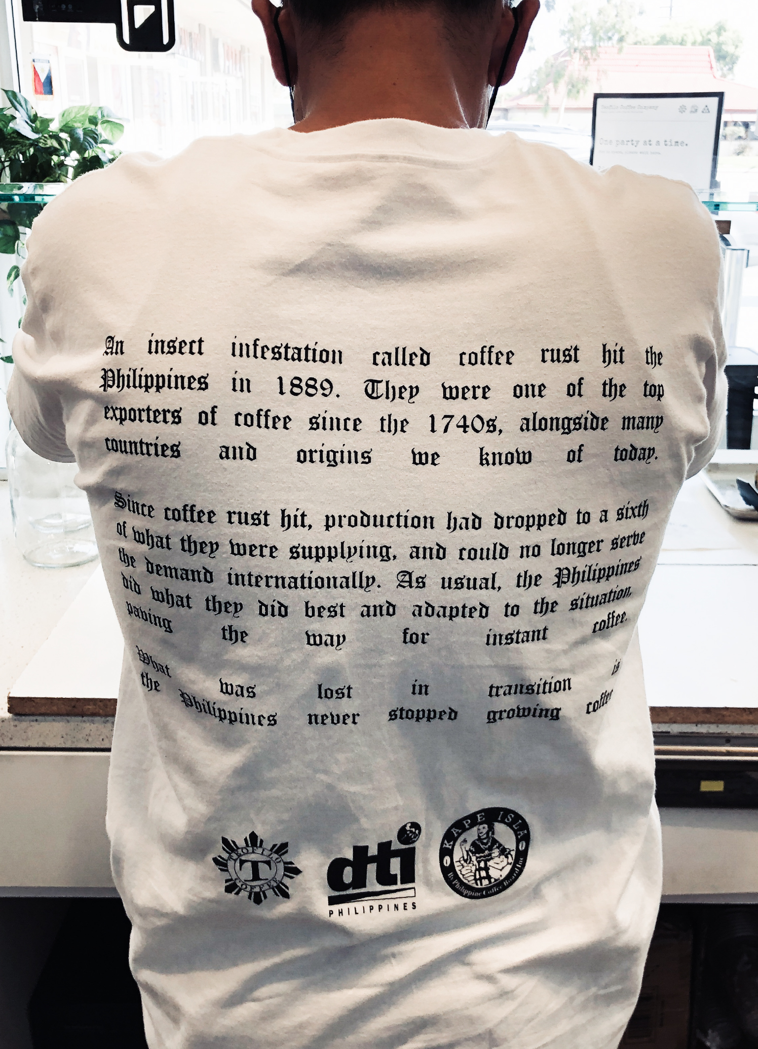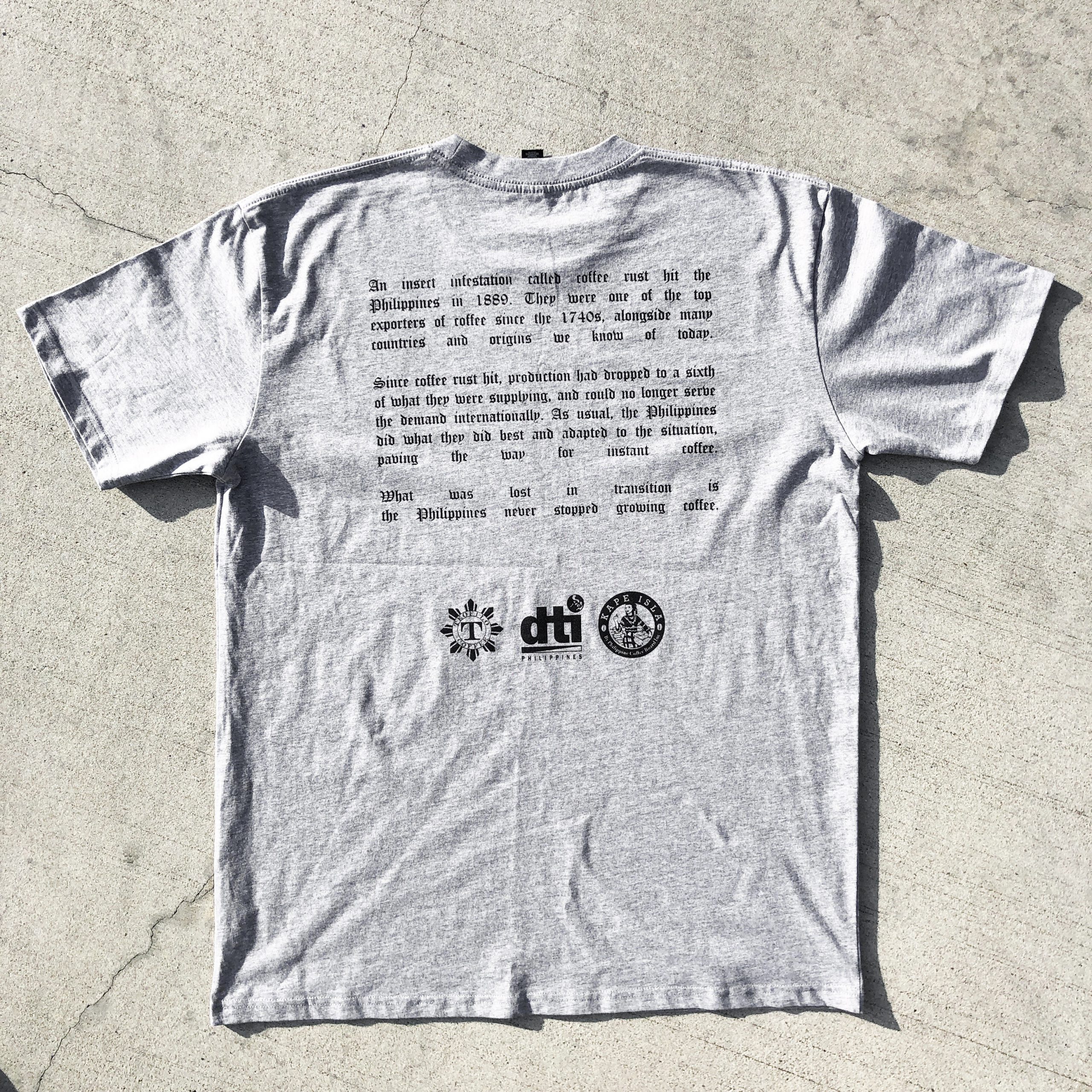 This tee is an expression of our efforts in highlighting how special Filipino coffee is. We have also been in coordination with Philippine Coffee Board Inc (PCBI) as well as Department of Trade and Industry of the Philippines (DTI Philippines), therefore this every shirt yields a donation for PCBI.